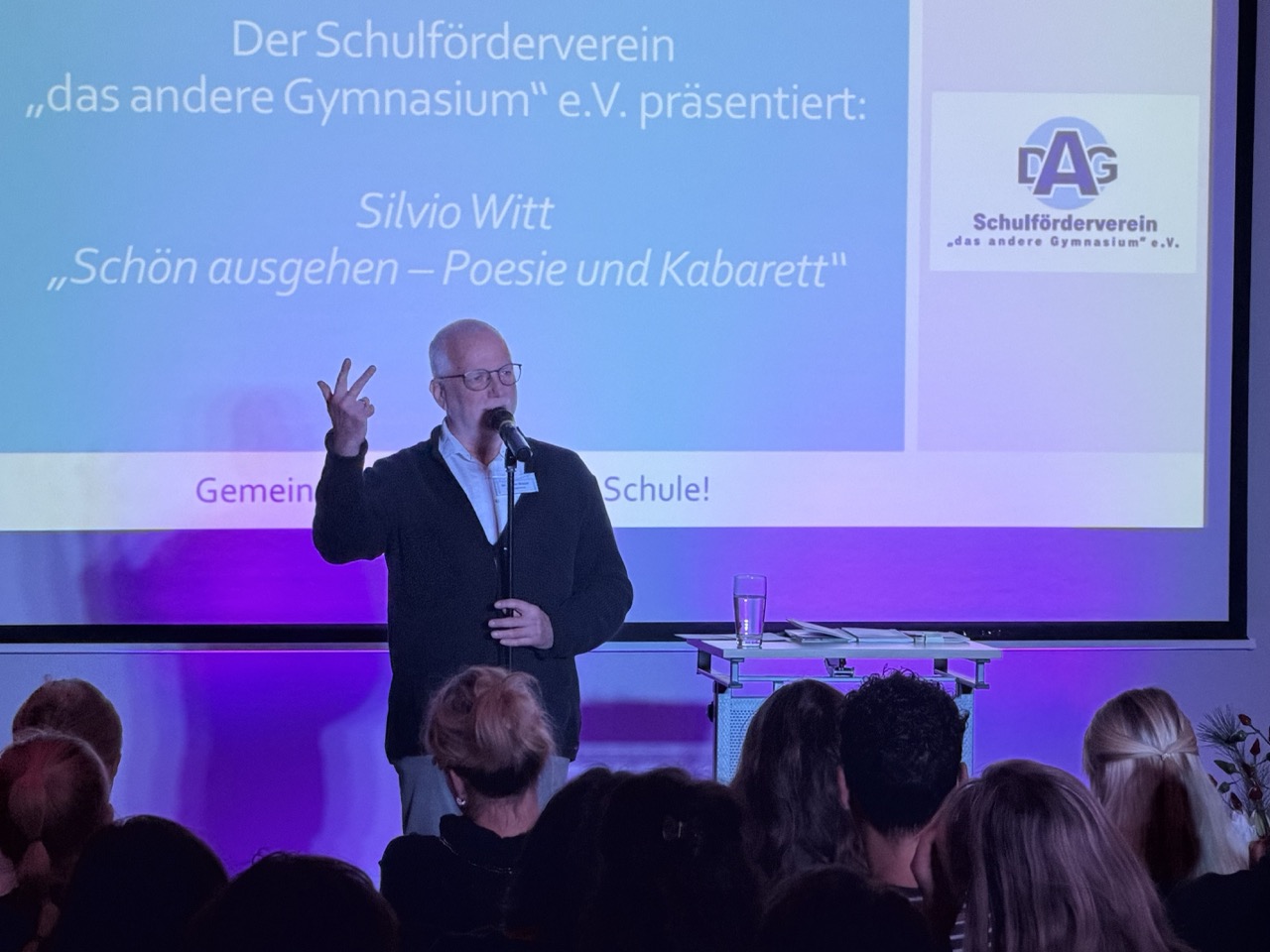 Anfang Dezember lud der Schulförderverein „das andere Gymnasium“ e.V. zu einem besonderen kulturellen Abend ins Auditorium der Schule ein. Unter dem Titel „Schön ausgehen – Poesie und Kabarett“ gastierte der Kabarettist Silvio Witt – und traf damit offensichtlich ins Schwarze: Der Saal war ausverkauft.