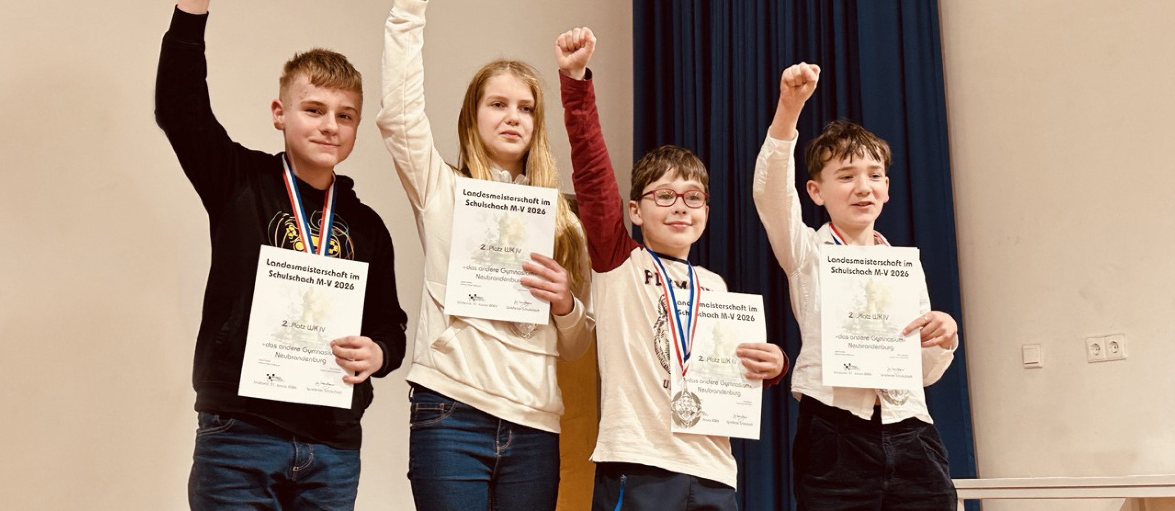 Erstmals war auch „das andere Gymnasium“ mit einer Mannschaft in der WK IV vertreten. Jakob Fiddike (Kl. 5a), Emil Hübner (Kl. 6a), Johanna Maria Roßmann (Kl. 6a) und Maxim Julius Schicktanz (Kl. 6b) fanden sich am Samstag um 7:00 Uhr morgens bei frischen -6°C am Busbahnhof ein, um gemeinsam mit anderen Schulmannschaften aus Neubrandenburg und Burg Stargard nach Stralsund zu fahren.
