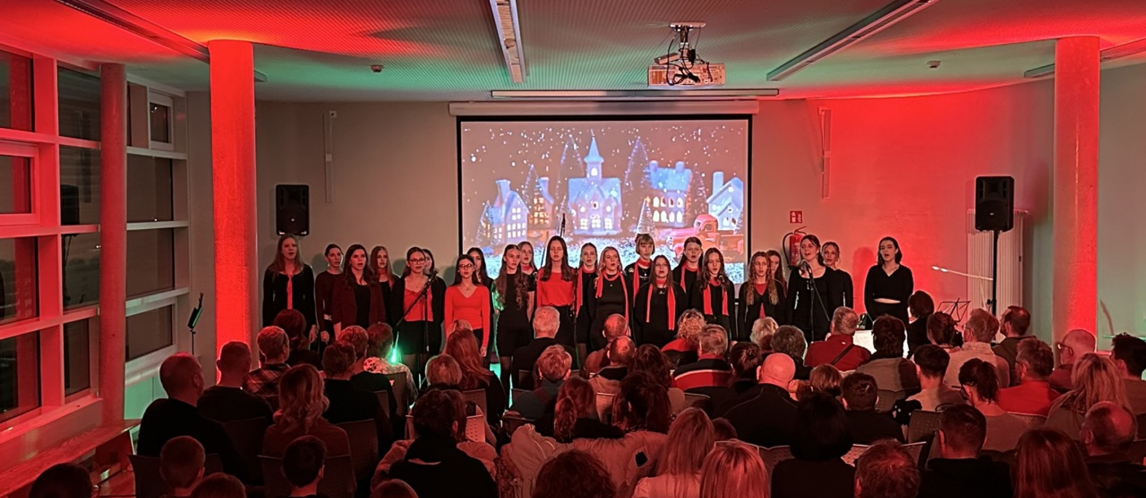 Der Chor sang viele verschiede Lieder, sowohl traditionelle wie Sind die Lichter angezündet, Lieder in anderen Sprachen wie Dona nobis pacem, Songs mit einer auffordernder Wirkung wie Heal the world als auch Songs von ABBA wie Mamma Mia. Zwischendurch bot unsere Schulband Die Dengels Abwechslung mit ihrem Schlagzeug und E-Gitarren. Die Dengels sind Mara als Sängerin, Finn an der E-Gitarre, Mika mit dem Bass und Anton am Schlagzeug. Songs wie Irgendwie, irgendwo, irgendwann und Major Tom begeisterten das Publikum. Es gab auch Lieder, die vom Chor und der Band gemeinsam gespielt wurden und zum Ende des Konzerts verstärkten noch Schüler*innen der 11. und 12 Klasse Band und Chor auf der Bühne. Solos verschiedener Schülerinnen sorgten für Abwechslung und Gänsehaut-Momente.
