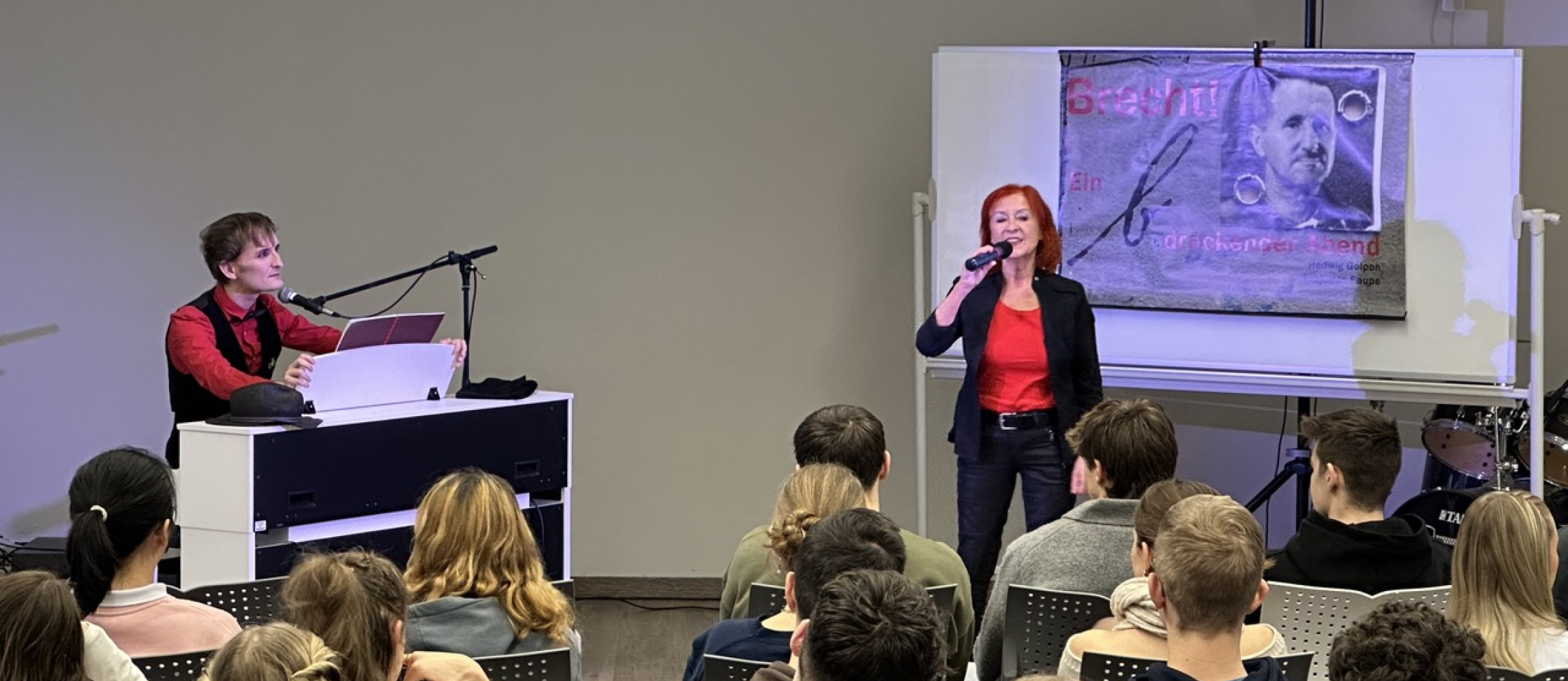 Gemeinsam verstanden es beide Künstler, die originalen Texte von Bertolt Brecht in Dialogen, Monologen und Gesangsstücken unterzubringen und diese mit Leidenschaft und Enthusiasmus den Schülerinnen und Schülern zu präsentieren.