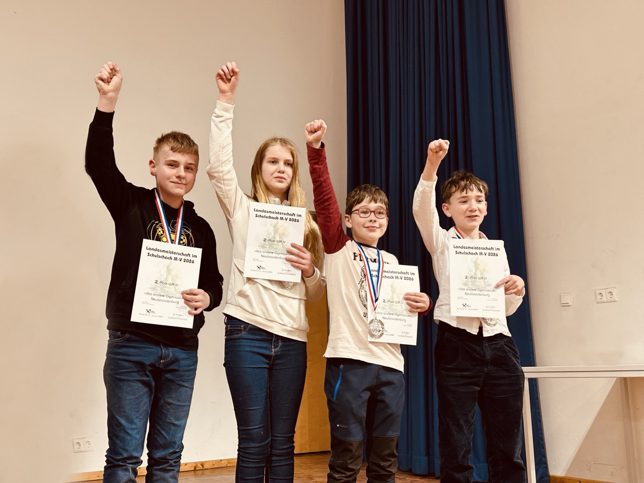 Erstmals war auch „das andere Gymnasium“ mit einer Mannschaft in der WK IV vertreten. Jakob Fiddike (Kl. 5a), Emil Hübner (Kl. 6a), Johanna Maria Roßmann (Kl. 6a) und Maxim Julius Schicktanz (Kl. 6b) fanden sich am Samstag um 7:00 Uhr morgens bei frischen -6°C am Busbahnhof ein, um gemeinsam mit anderen Schulmannschaften aus Neubrandenburg und Burg Stargard nach Stralsund zu fahren.
